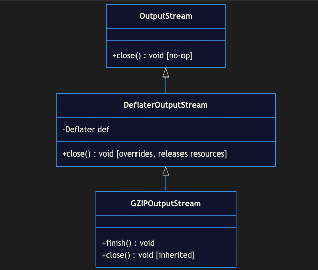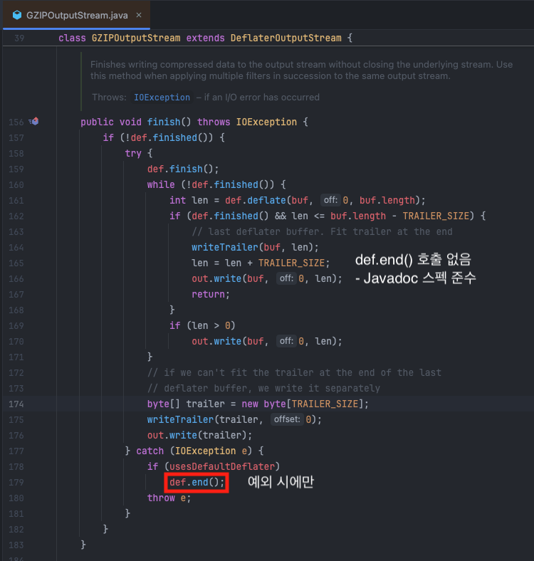 OpenJDK의 설계 철학은 Javadoc 명세를 충실히 따르는 것이었습니다. finish() 메서드의 Javadoc에는 "without closing the underlying stream" 이라고 명시되어 있습니다. 스트림을 닫지 않고 여러 압축 블록을 순차적으로 쓸 수 있도록 하기 위한 설계였죠.
