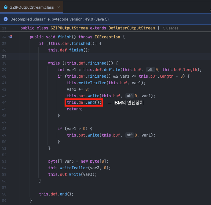 IBM J9 VM 1.6.0의 GZIPOutputStream.finish() 구현을 디컴파일해보니 이런 코드가 있었습니다.this.def는 Deflater 객체를 가리킵니다.
